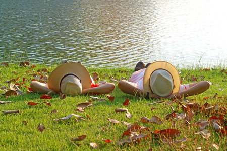 Couple in wide brim hat lying side by side on the sunny waterfront