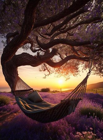 ai generated An evening or lazy morning at lavender farm with hammock under the ttree