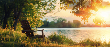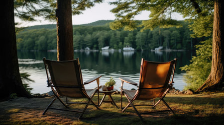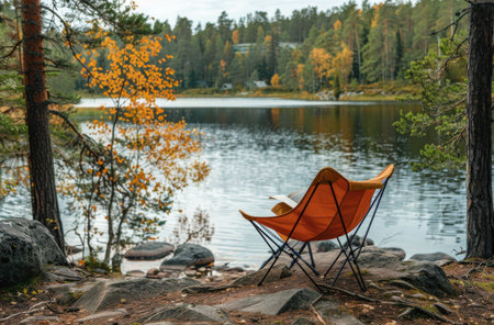 A folding chair sits on the shore of a serene lake, surrounded by a lush forest, offering a peaceful spot to relax and enjoy the beauty of nature.