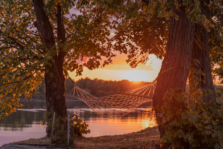 Riverbank with hammock for relaxing on a warm fall evening at sunset with backlit red sun, a place to relax in nature.
