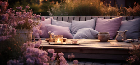 an outdoor scene with candles and flowers on a sofa.