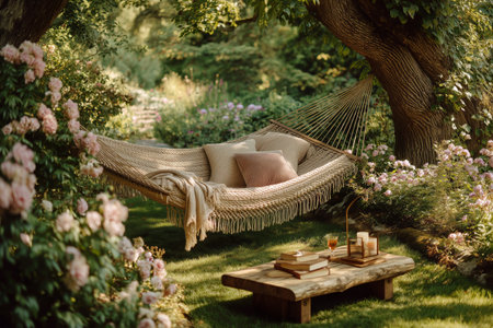A peaceful garden features a comfortable hammock draped with soft pillows, surrounded by blooming flowers under trees during golden hour. A small table holds drinks and books.