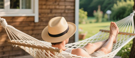 A young man wearing a straw hat relaxing on a white hammock in a sunny backyard garden. Peaceful outdoor lifestyle scene representing leisure, freedom, and summer vacation vibes.