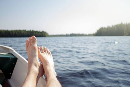Legs on Board of a Small Boat on Lake at Sunny Calm Day