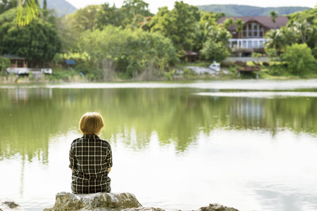Asia woman from back sitting alone on rock and looking for a lake view