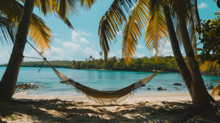 A hammock is swaying between two tall palm trees on a sandy beach, overlooking the crystalclear water and blue sky. The natural landscape is serene and perfect for relaxation AIG50