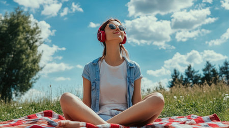 Woman with wireless headphones relaxing on a picnic blanket, enjoying music under a blue sky