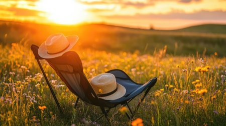 A folding camp chair with a hat resting on it, situated in an open field with wildflowers.