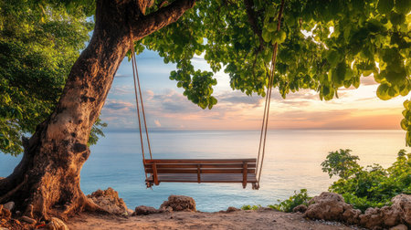 A tranquil coastal scene featuring a wooden swing hanging from a lush green tree, overlooking calm ocean waters at sunset, creating a peaceful atmosphere.