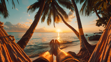 A person's feet are visible as they relax in a hammock strung between two palm trees on a beach at sunset.