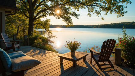 Experience the ultimate relaxation with this serene lakeside scene. A wooden deck extends towards tranquil water, framed by the warm hues of a sunset. Two classic Adirondack chairs invite you to unwind and embrace the peaceful atmosphere. This scenic landscape captures the essence of summer bliss, perfect for evoking feelings of relaxation and tranquility. Ideal for travel, home d