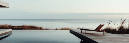 With a lounge chair by the edge of the infinity pool, this modern design features sleek stone tiles and a wooden deck, using muted pastel tones for a tranquil, minimalist atmosphere with ocean views