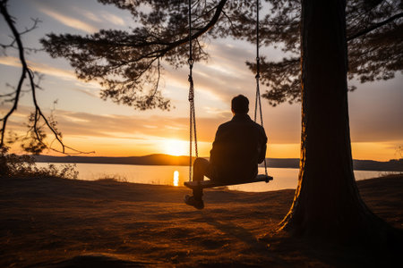 Silhouette of a man sitting on a swing at sunset.