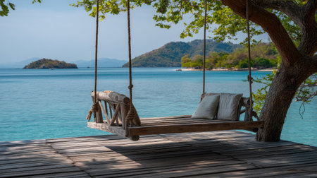 A peaceful swing hangs from a tree, overlooking clear blue waters and distant islands. Ideal for relaxation and capturing tropical beauty in summer.
