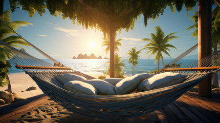empty hammock hanging from palm trees near sea at sandy beach during sunset - ai
