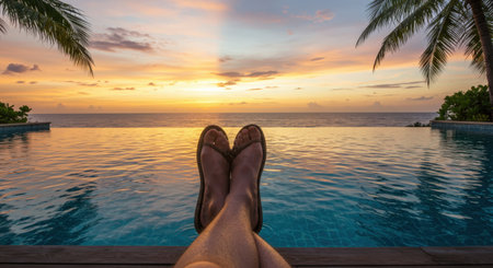 Woman legs on the edge of a swimming pool during sunset or sunrise