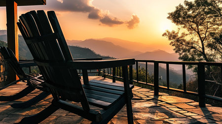 Black wooden chairs on cabin terrace with mountain view at sunset