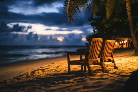 Two wooden chairs sit on a sandy beach, facing the ocean as twilight casts a serene glow over the water.