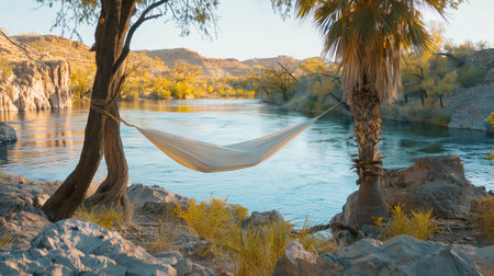 Tranquil hammock between palm trees on beach rivers edge, gently swaying in the breeze