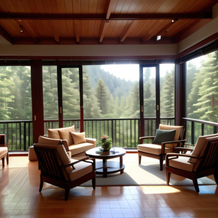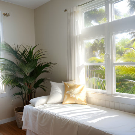 Cozy summer retreat with natural light and vibrant greenery in a serene space.