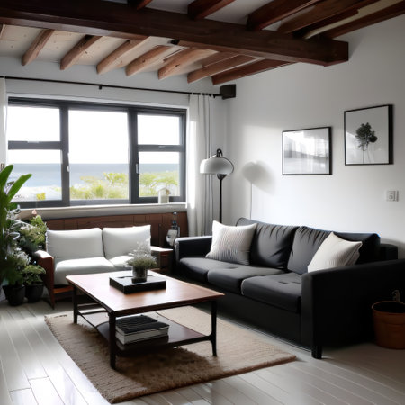 Sunlight streams into a minimalist living room featuring a sofa, coffee table, and plants. The room has a calming, serene atmosphere.