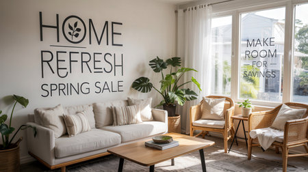 Modern living room interior with text Home Refresh Spring Sale and Make Room for Savings on walls and window, featuring cozy furniture and indoor plants.