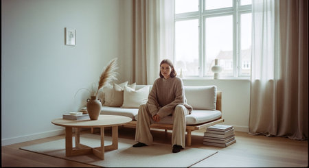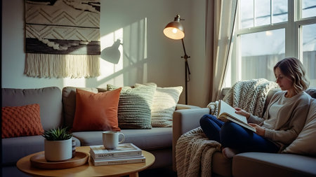 A serene living room with a white couch, wooden coffee table, and natural textures, featuring a plant, book, and coffee cup, with warm sunlight streaming through the window.