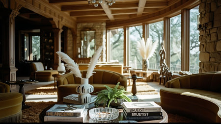 Living room decor, home interior design . Art Deco Contemporary style with Large Window decorated with Velvet and Marble material . Generative AI AIG26.