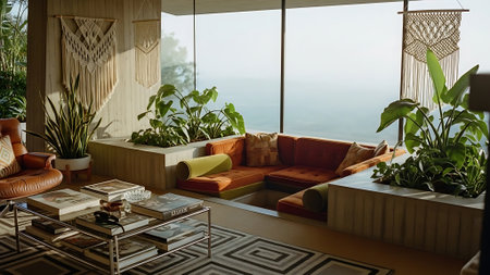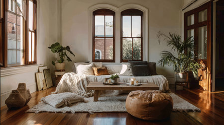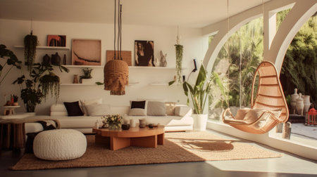 Interior design of Living Room in Bohemian style with Large windows decorated with Velvet, Wood, Rattan, Linen, Leather material. Beachy architecture. Generative AI AIG24.