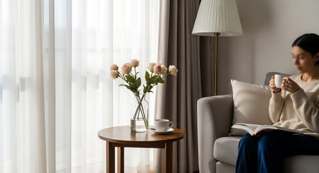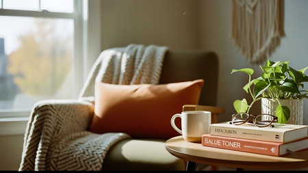 A cozy living room scene featuring a vase with dried flowers, a coffee cup on a stack of books, and soft sunlight streaming through blinds
