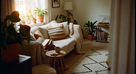 A warm living room featuring a beige sofa with a knitted blanket, a cup of coffee, magazines, and several potted plants on a wooden side table.