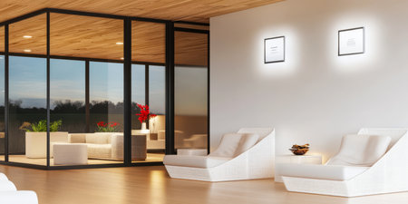 Two stylish lounge chairs are positioned in a contemporary space with large glass windows. The evening light softly illuminates the area showcasing a serene atmosphere with framed artwork.