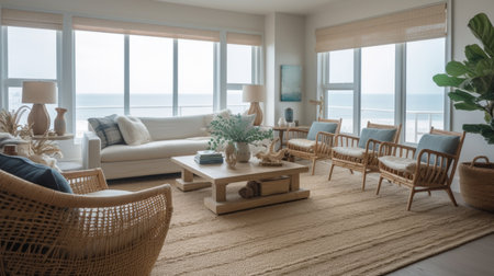 Interior design of Living Room in Coastal style with Large windows with ocean view decorated with Woven rattan chairs, jute rug material. Coastal architecture. Generative AI AIG24.