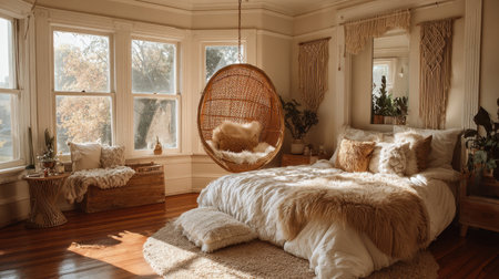 Hanging egg chair suspended from ceiling in boho-style interior with macram accents