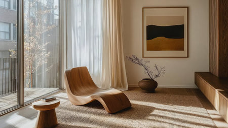 A cozy modern living room featuring a unique wooden lounge chair, artistic decor, and flowing natural light, creating a serene and inviting atmosphere.
