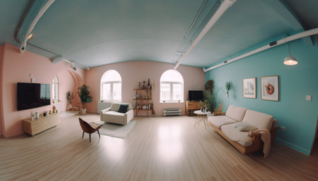 A spacious and bright rest area with a sofa and soothing green plants in the living room, generated AI