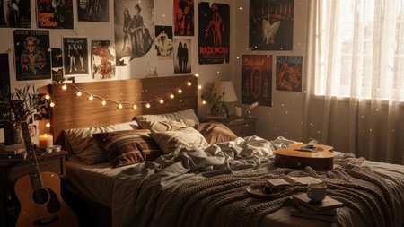 Bedroom interior in the evening with lights and a guitar on the foreground