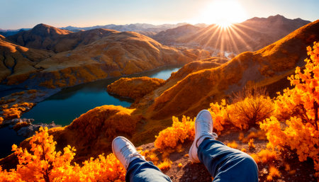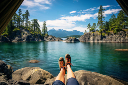 Traveler s feet on mountain summit, overlooking lake and river hiking adventure with scenic view