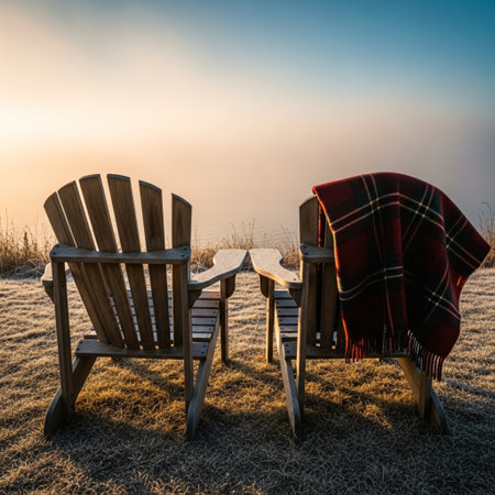 Two wooden chairs with a plaid on a meadow at sunrise