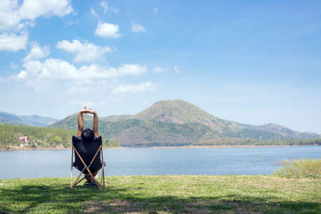 Man sitting on chair on green grass on blue clear sky background,freedom concept.