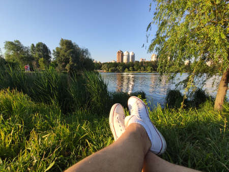 Legs of traveler sitting in a park, relaxing and enjoying the view of the city. Freedom concept
