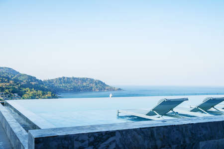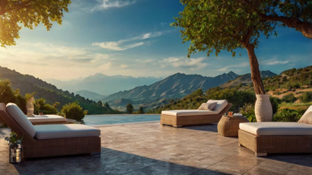 Swimming pool with sun loungers and mountains in the background
