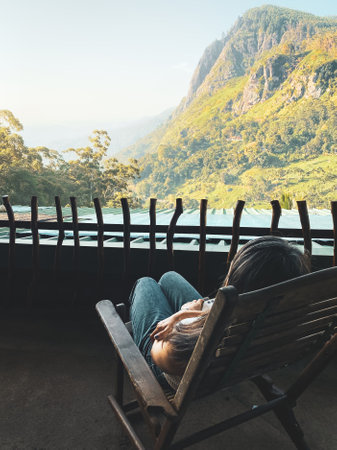 Woman sit in chair drink fresh mango juice in balcony viewpoint by breathtaking Ella Rock landmark panorama in Sri Lanka. Popular tourism travel destination in Srilanka. Blogger traveler enjoy views