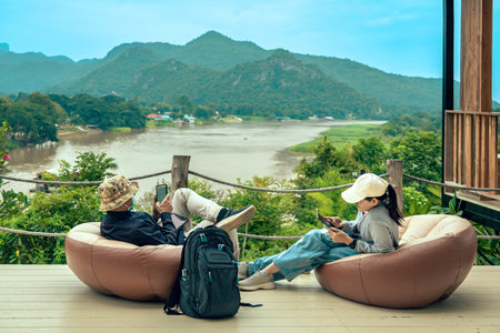 Male tourist wear hat with face mask and his wife use mobile phone and sit to relax on large cushions on balcony with mountains and river in background. Traveller in bag chair enjoy outdoor nature.