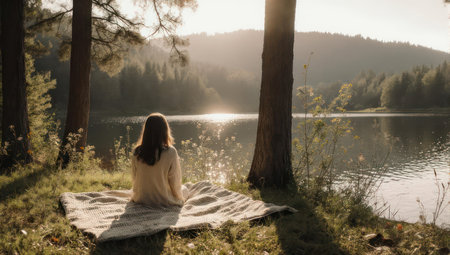 A person sits by a lake, enjoying sunlight filtering through trees, with serene natural beauty
