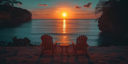 Two empty chairs face a breathtaking sunset over the calm waters of a secluded tropical beach, creating a tranquil and romantic scene.