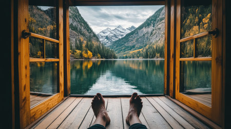 Experience a tranquil escape as you gaze out of a cozy cabin, revealing a serene lake and majestic mountains, surrounded by vibrant autumn colors.