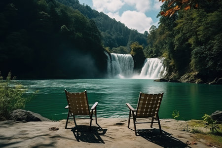 Two chairs for relaxing on the bank of a calm river with overlooking the waterfall. Camping, recreation.