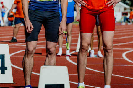 Closeup of relay runners passing the baton during a track and field event, showcasing teamwork, speed, and the thrill of competition in a stadium setting