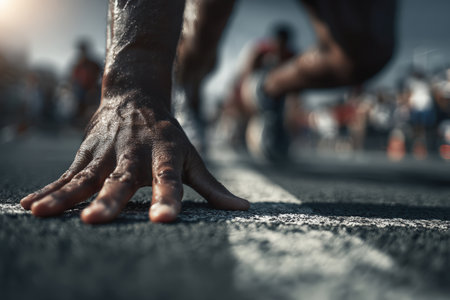Macro shot capturing a runner's hands poised on the starting line, highlighting focus and tension before a race. The cinematic detail emphasizes the anticipation and energy of the moment.